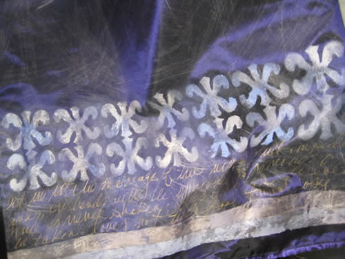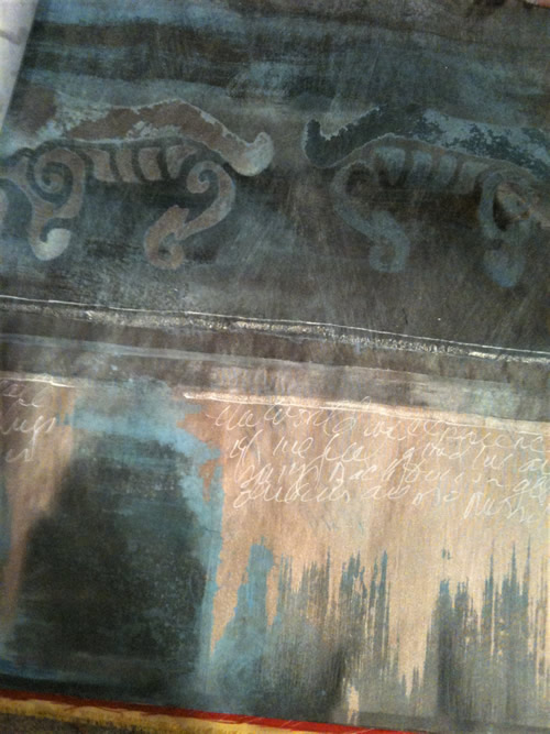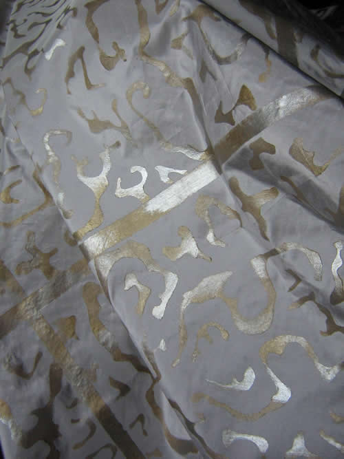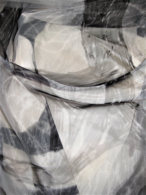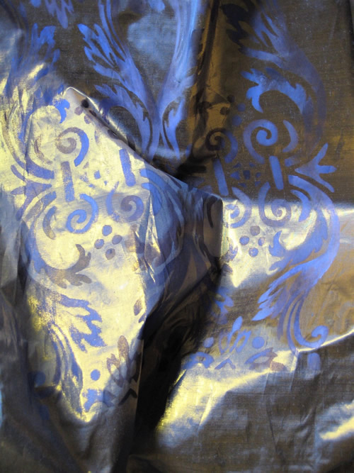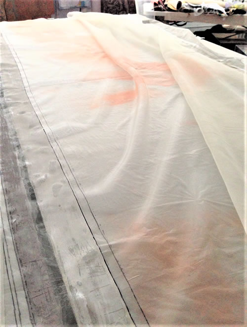 The hand painting of the fabrics allows for unique color variations throughout each panel, so no two panels are alike. Our metallic pigments used on iridescent silks allow for different light relection effects, and painting on sheers gives color layering effects—seeing a color through another color.