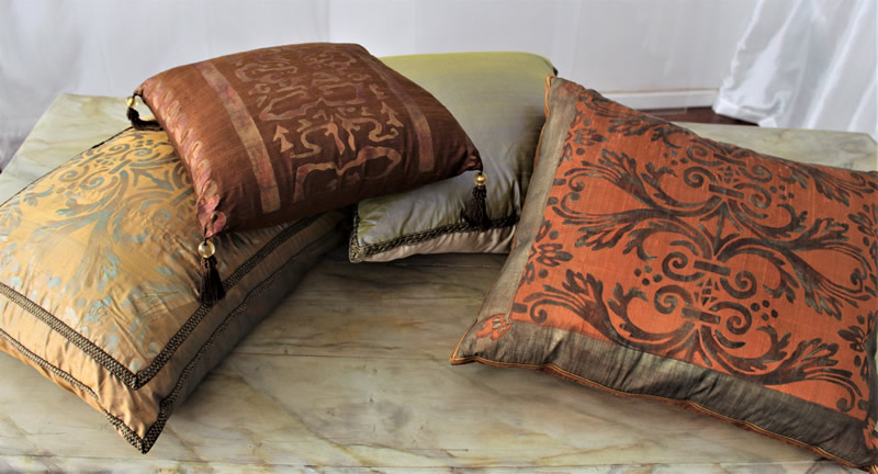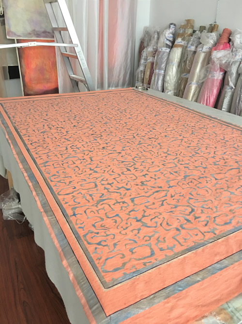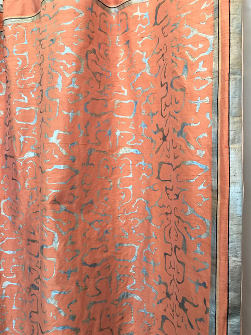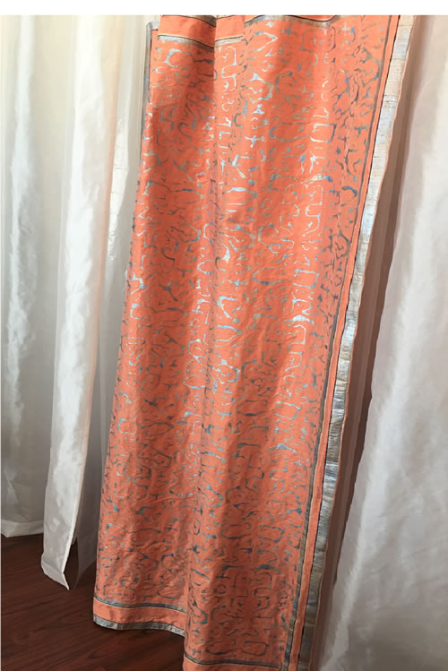 Isabelle H. painted Decorative Fabric Panels work like hanging tapestries, acting as powerful accents to the walls. They can serve in entryways, bedrooms, or above sofas to create visual vistas. Our fabric panels are sheers, cottons, linens, silks, and velvets, that can also be made into curtain panels, throws, and pillows to further act as focal accents within the surrounding color design.
